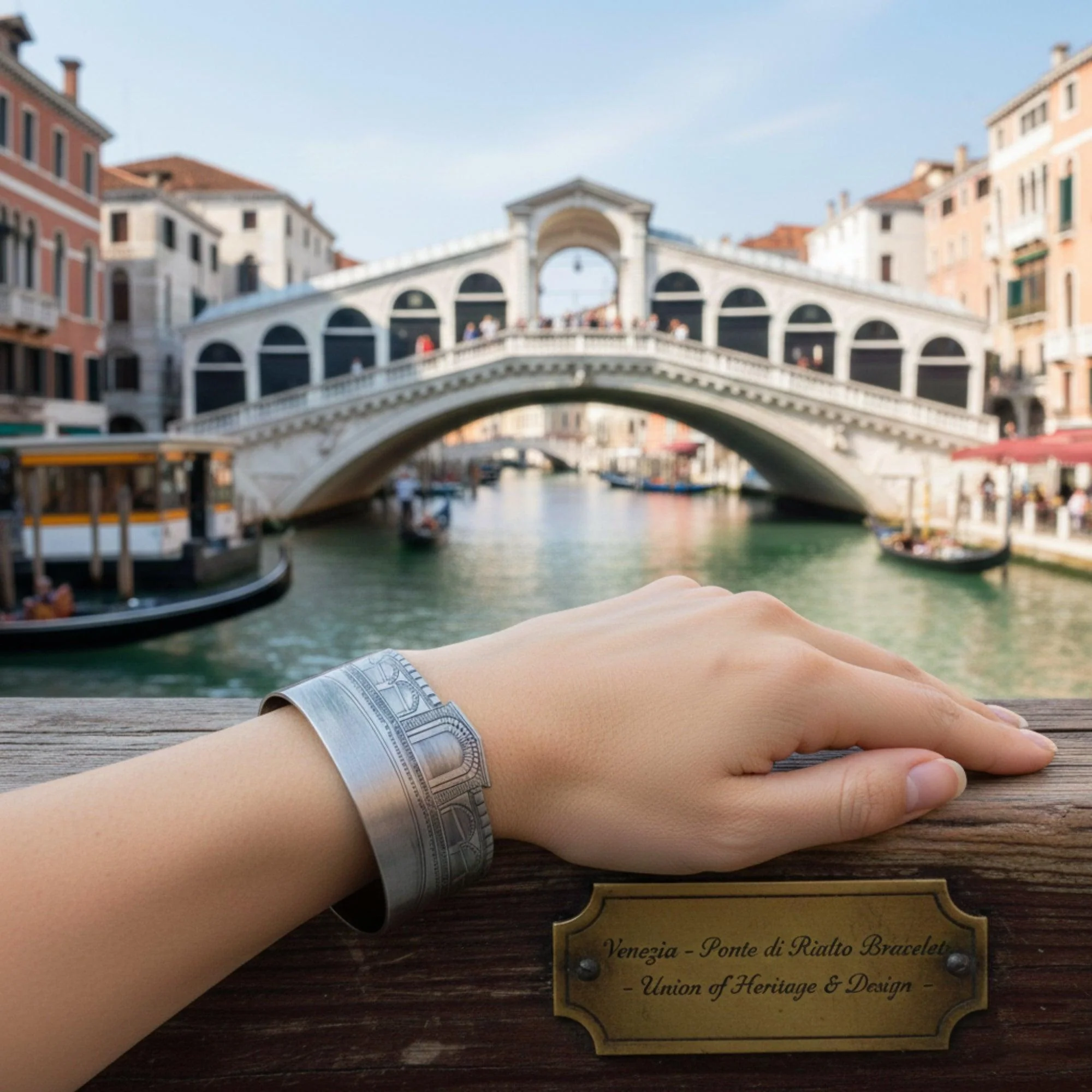 Il Bracciale Ponte di Rialto è un gioiello in ottone esclusivo ispirato al celebre Ponte di Venezia che attraversa il Canal Grande. Questo bracciale rigido riproduce i dettagli architettonici del ponte in modo raffinato, catturando la sua bellezza storica e la sua importanza culturale. Ogni elemento del bracciale è finemente lavorato, con particolare attenzione alla precisione dei dettagli, rendendo questo accessorio un tributo perfetto alla città lagunare.