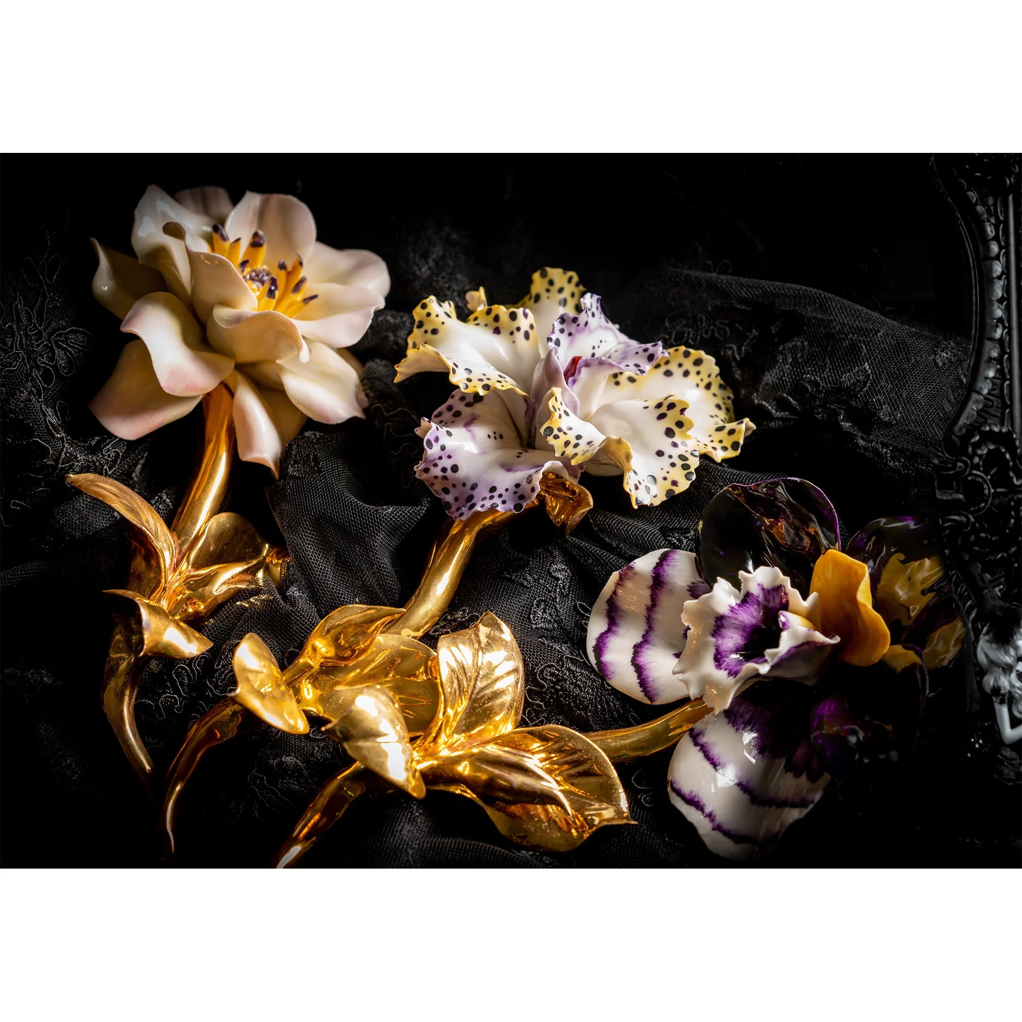 Questa Camelia con gambo oro in porcellana di Capodimonte, è modellata a mano con petali curati nei minimi dettagli, dipinti con tonalità delicate che richiamano la naturalezza del fiore. Lo stelo dorato aggiunge un tocco di lusso e luminosità all'intera composizione.
