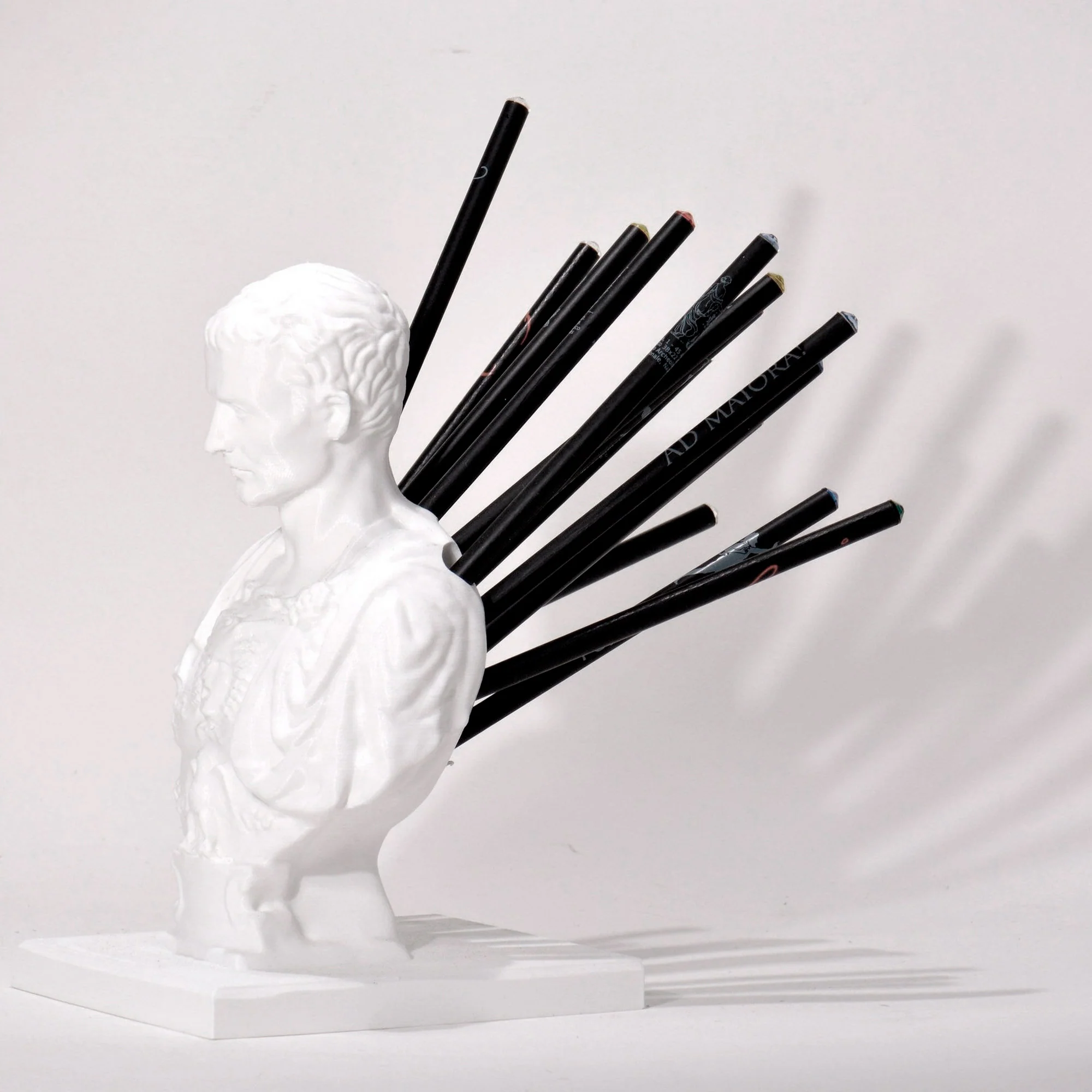 Il busto portapenne di Giulio Cesare, è realizzato in PLA e stampato in 3D con tecnica additiva. È un accessorio elegante e funzionale per la tua scrivania, ma anche un omaggio all’arte classica e alla cultura antica.