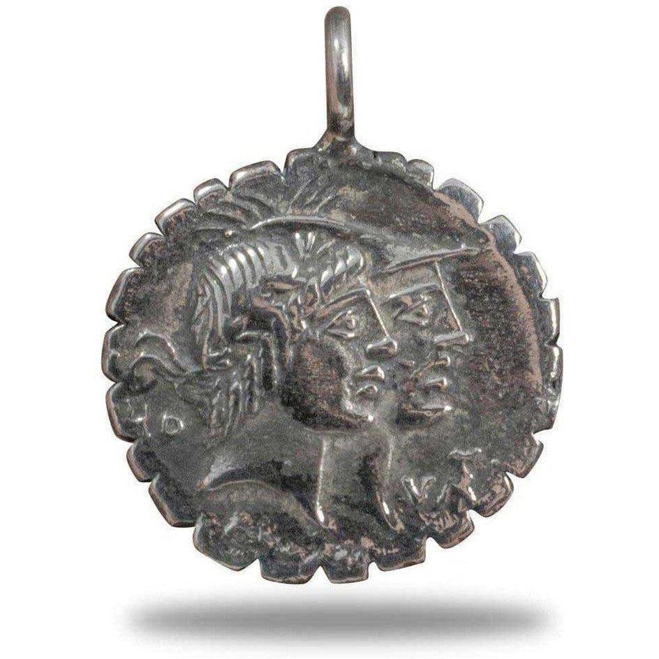 Questo Ciondolo a forma di moneta è una riproduzione in Argento 925 di una moneta antica con incisione.