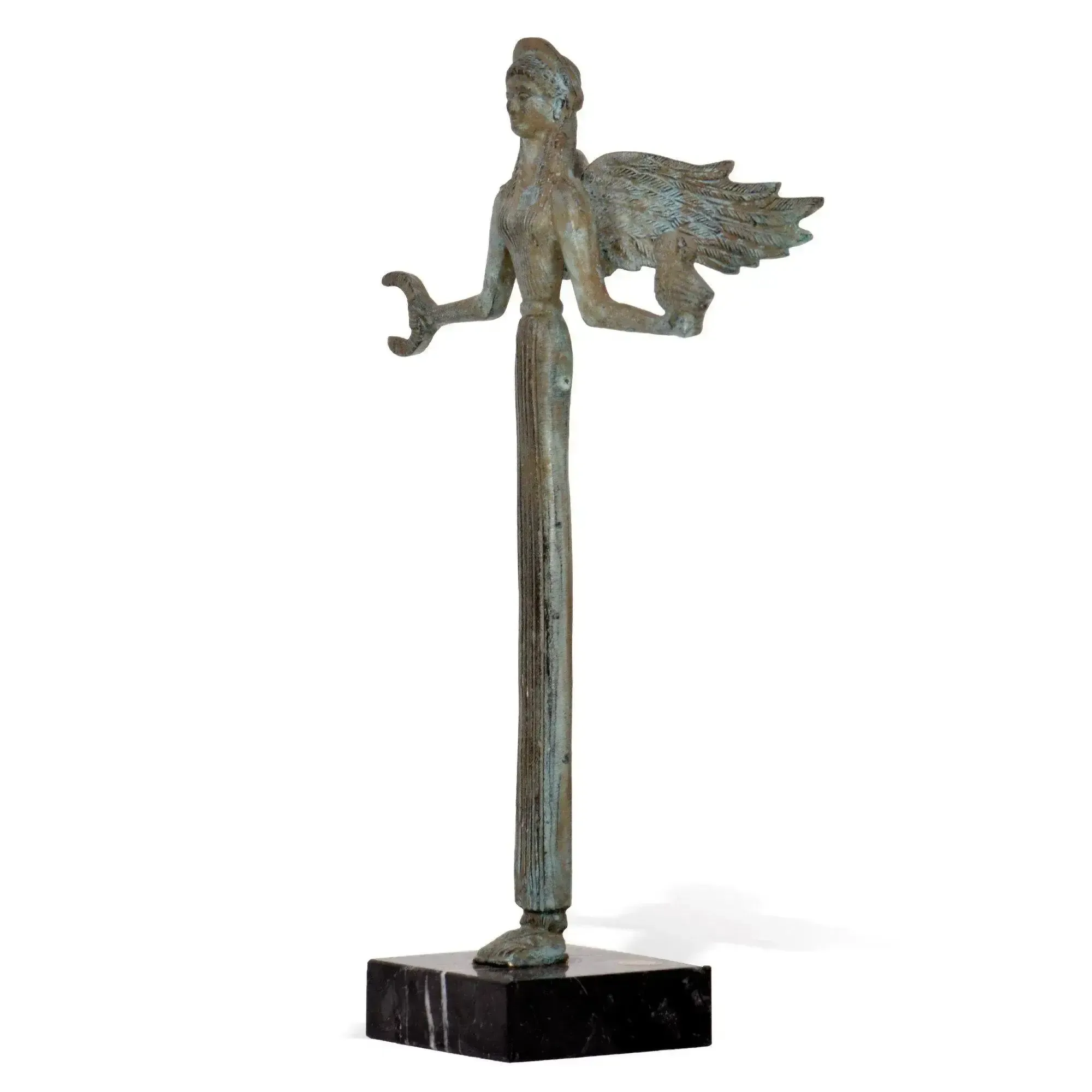 Questa scultura raffigurante la Nike Alata, è una riproduzione in bronzo della statua originale, custodita al Museo Nazionale Archeologico di Atene.